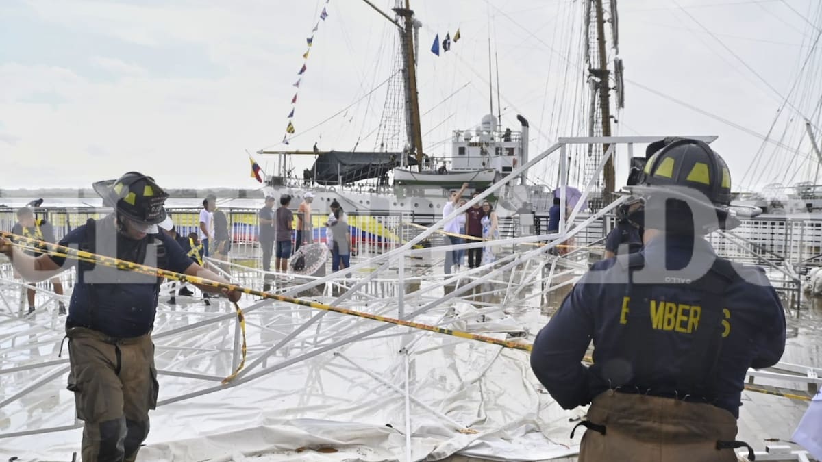 El intendente Fabián Palencia, del área de Turismo de la Policía Metropolitana de Barranquilla, explicó que la brisa tumbó una carpa dispuesta por la Armada Nacional para resguardar del sol y lluvia a los asistentes, la cual cayó sobre varias personas que observaban la embarcación.