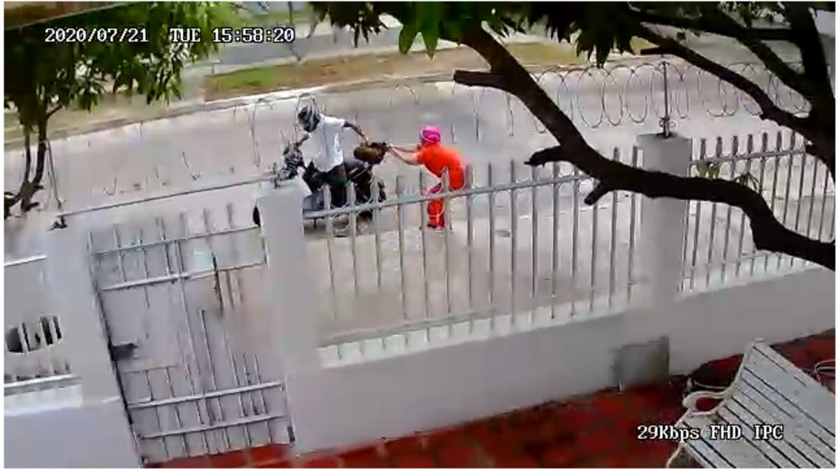 La mujer, vestida con un uniforme naranja, un gorro rosado y un colorido tapabocas, iba caminando por el frente de una vivienda cuando un hombre en motocicleta se parqueó en la orilla de la calle. Él se bajó de la moto sin quitarse el casco y, por la espalda, abordó a la mujer. Corrió hacia ella y, con una mano detrás, le agarró el bolso. La mujer no se lo dejó quitar.