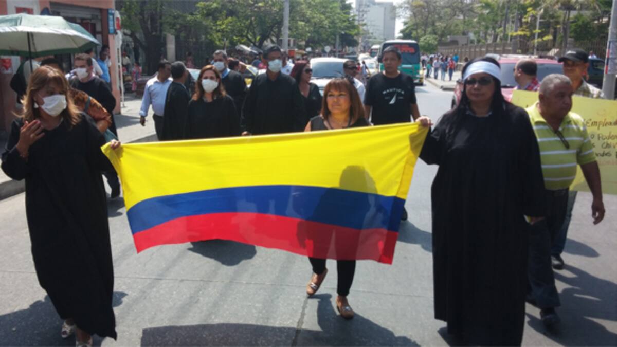 Con pancartas y cadenas de oración los jueces del Centro Cívico de Barranquilla manifiestan este viernes su inconformidad por la captura del juez 22 Abelardo Andrade, investigado por conceder libertad al exgobernador de La Guajira Juan Francisco Gómez Cerchar.