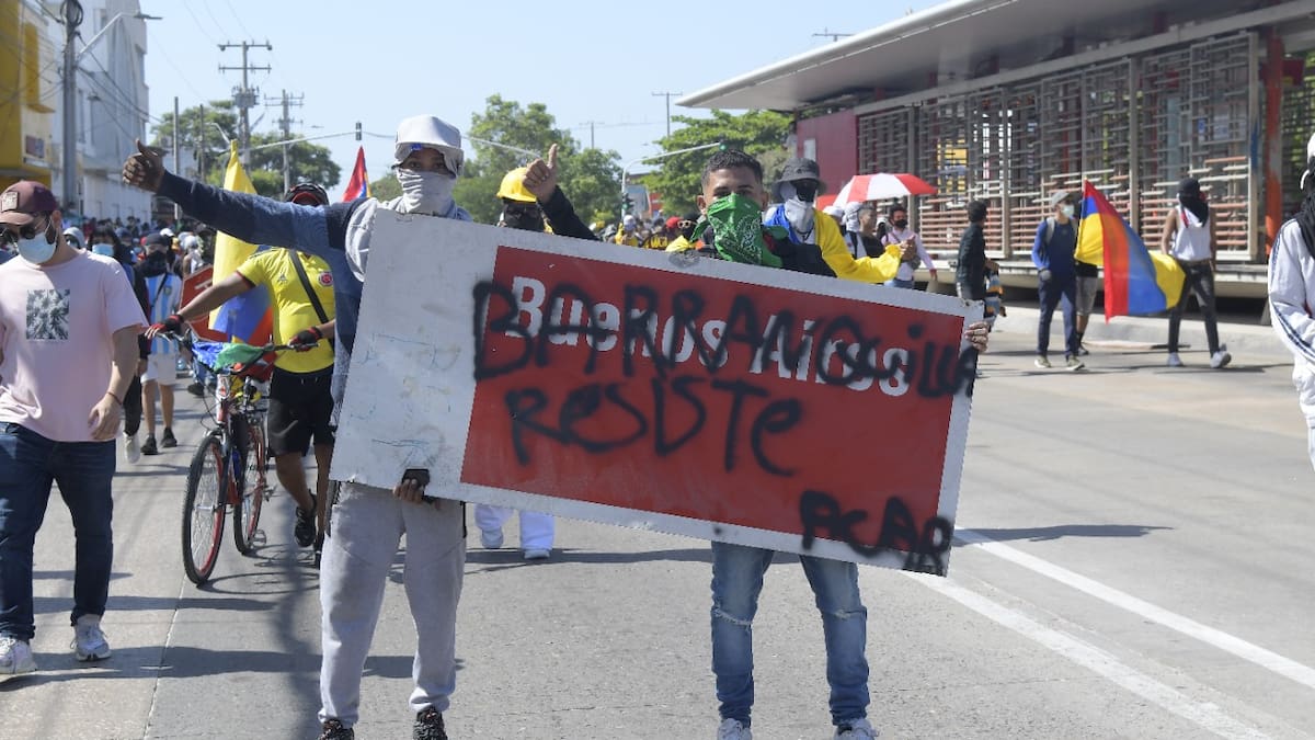 'Varios encapuchados empezaron a sacar de los morrales bombas molotov y todo tipo de elementos para atacar a la fuerza pública que todo el tiempo se instaló unos metros después de la escuela de policía para contener a las personas que intentaban llegar hasta la instalación de nuestra institución. Pudimos evidenciar que muchas personas que se estaban enfrentando con el Esmad estaban bajo los efectos de sustancias alucinógenas', agregó.