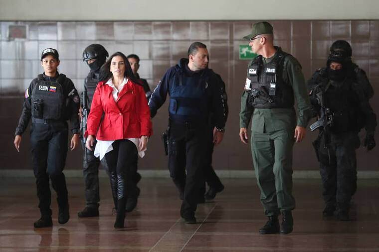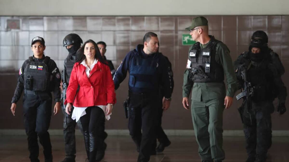 La exsenadora barranquillera arribó a los tribunales luciendo un blazer rojo y custodiada por agentes del Servicio Bolivariano de Inteligencia Nacional.