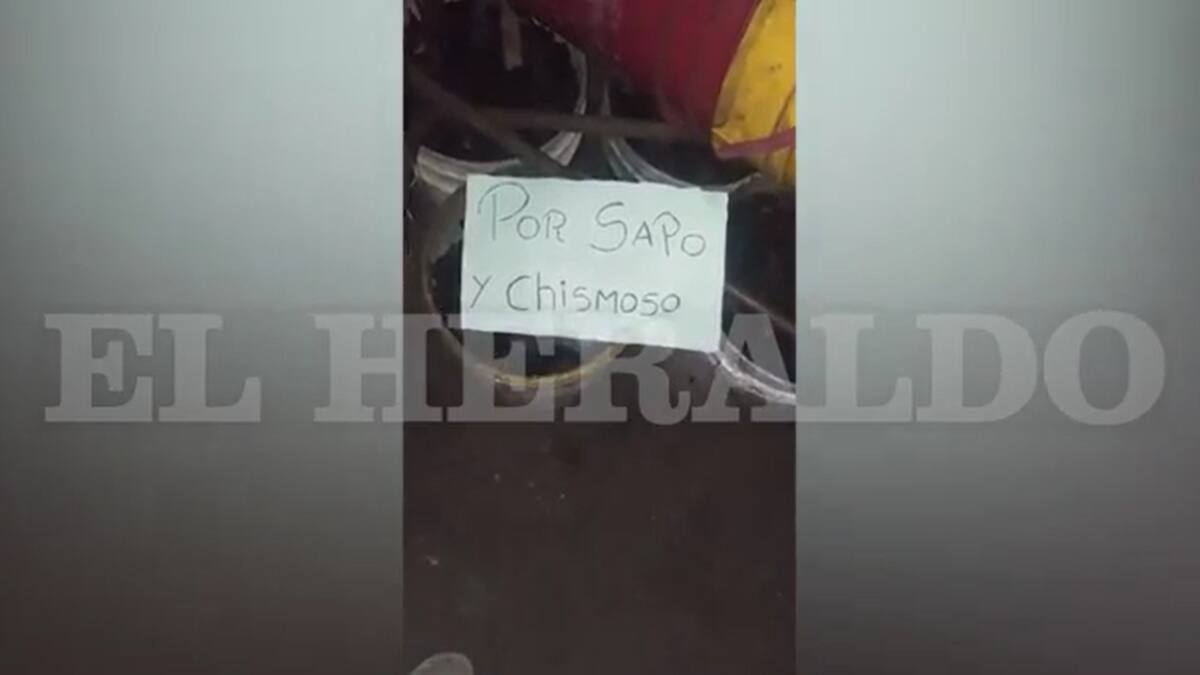 Las víctimas estaban sentadas en un viejo y corroído sofá color beige. Las autoridades hallaron cartel con el mensaje "por sapo y chismoso".