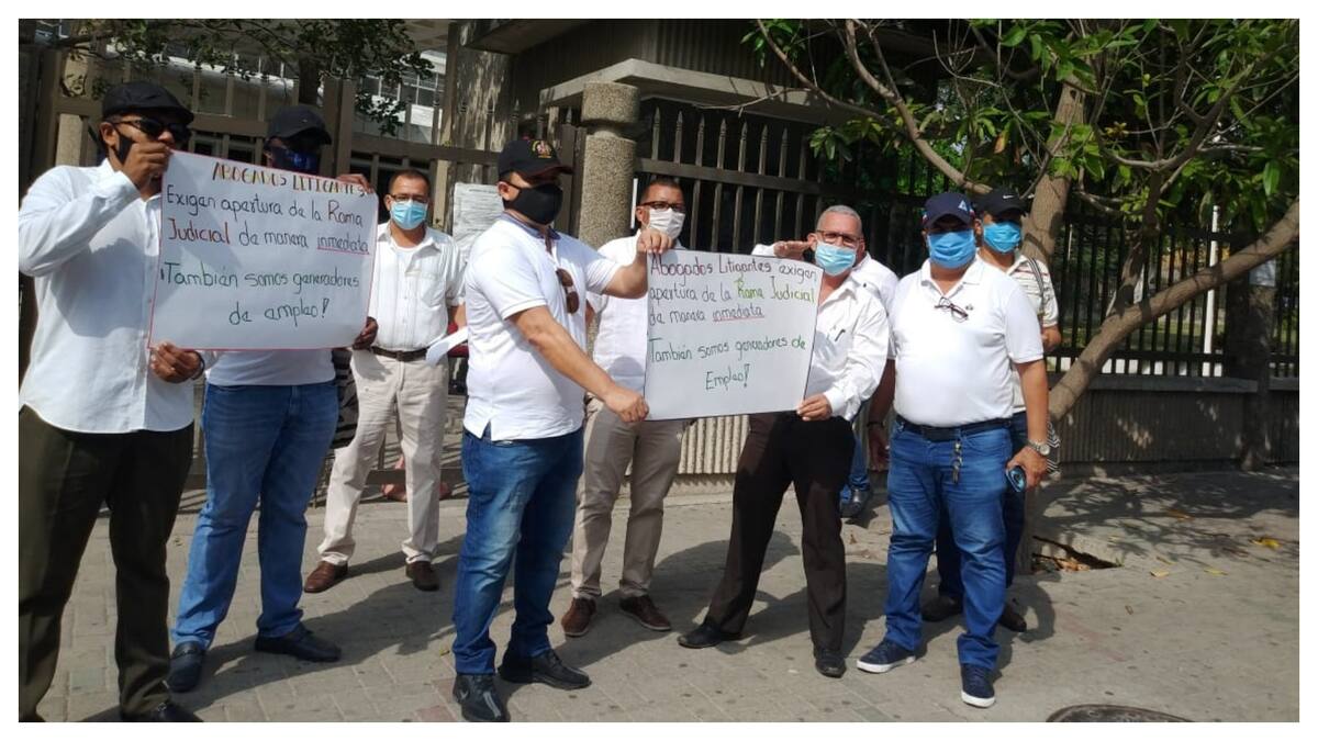 Con pancartas, pero también con tapabocas y guantes, un grupo de abogados penalistas protestaron de manera pacífica para exigir la reapertura de la Rama Judicial que, con motivo de la pandemia del coronavirus, permanece cerrada desde hace casi dos meses, afectando los procesos y así mismo, sus bolsillos, según reportaron a través de la línea Wasapea a EL HERALDO.