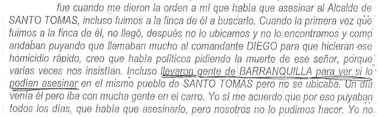 Mejía vivió el acecho en carne propia. Hay varios exmiembros del Bloque Norte que así lo han contado, como José Mauricio Acuña Oñate, alias Leo. 'A la primera persona que le dieron la orden de matar al Alcalde de Santo Tomás fue a mí'. Leo confesó que los 'andaban puyando' desde la jefatura de las AUC en el Atlántico.