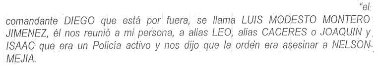 Eliécer Remón Orozco, quien en la Oriental era apodado Cochebala, declaró que Luis Modesto Montero Jiménez lo reunió a él, Leo, Cáceres o Joaquín y a un policía activo que apodaban Isaac. 'El comandante Diego, que está por fuera (libre), nos dijo que la orden era asesinar a Nelson Mejía'.