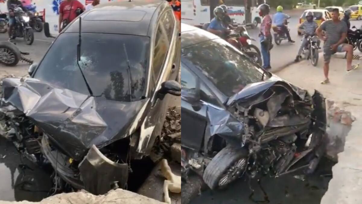 En varios videos quedó registrado cómo quedó el vehículo tras el aparatoso accidente. En las imágenes se aprecia que la parte frontal del carro quedó completamente destruida, con algunas llantas salidas y el panorámico roto.
