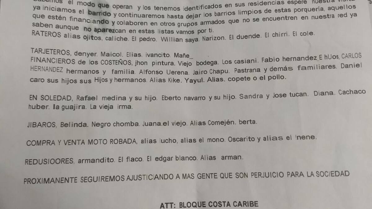 En el papel, que está firmado por el ‘Bloque Costa Caribe’ de las ‘Autodefensas Gaitanistas de Colombia’, se lee: 'Declaramos objetivo militar y muerte sin piedad. Fleteros, expendedores de drogas, tarjeteros, reducidores, ladrones y compra y venta de motos robadas. Dueños y trabajadores aliados al chance La Blanquita, principales financieros de los ‘Costeños’ para la compra de armas. Sabemos el modo en el que operan y los tenemos identificados en sus residencias, esperen nuestra visita, ya iniciamos el barrido y continuaremos hasta dejar los barrios limpios'.