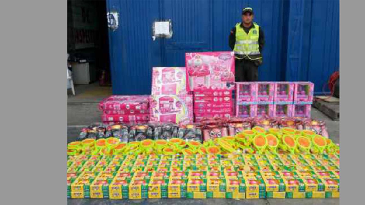 Entre lo decomisado por las autoridades, hay: 828 sonajeros para bebé, 180 raquetas plásticas para niños, 168 máscaras más brazo lanzador, 24 tocadores para niña, 12 cocinas pequeñas para niñas, 5 cocinas grandes para niña, todo avaluado por un valor aproximado de 49.000.000 de pesos.
