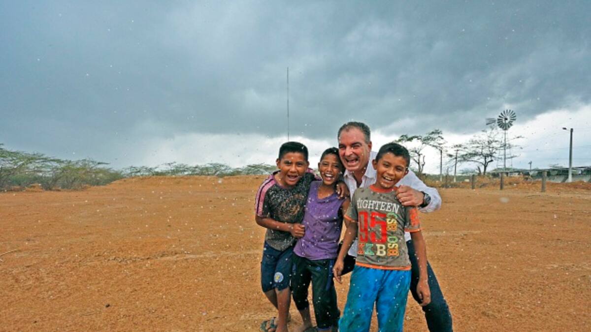 El ministro de Agricultura, Aurelio Iragorri, quien se encontraba en Uribia como veedor electoral, fue testigo excepcional del 'aguacero de la felicidad', como lo llamó, e incluso se tomó una foto junto a tres niños wayuu de Uribia, municipio beneficiario de la construcción de pozos profundos para aliviar la sequía.