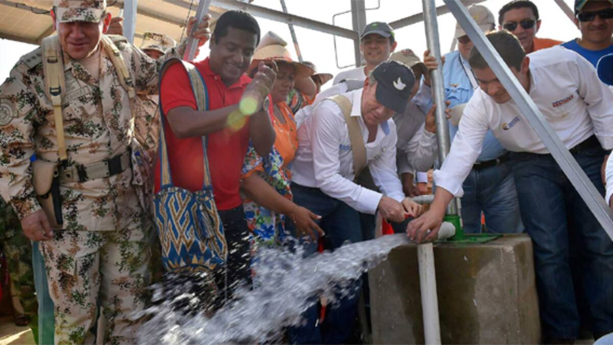 En La Guajira el presidente de la República Juan Manuel Santos entregó una solución integral de agua y productividad en la comunidad Kasisca de Manaure y un pozo en el corregimiento de Porshina en el municipio de Uribia en el marco de la Alianza por el Agua y la Vida en este departamento.