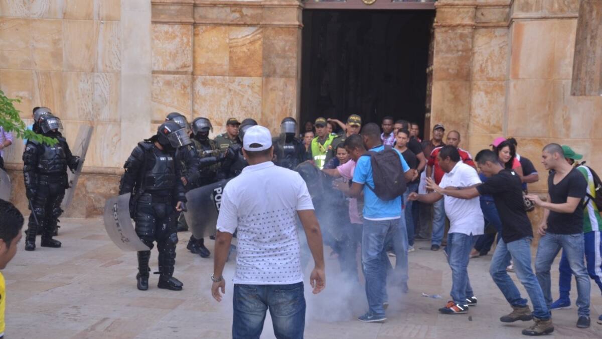 Varios estudiantes de la Universidad de La Guajira, cuyas actividades académicas y administrativas están paralizadas desde hace una semana por una profunda crisis financiera, intentaron ingresar a la Catedral Nuestra Señora de los Remedios de Riohacha, pero el grupo Esmad de la Policía lo impidió. Algunos con capuchas se subieron a lo más alto de la Catedral pero las fuerzas del orden lograron dispersarlos.