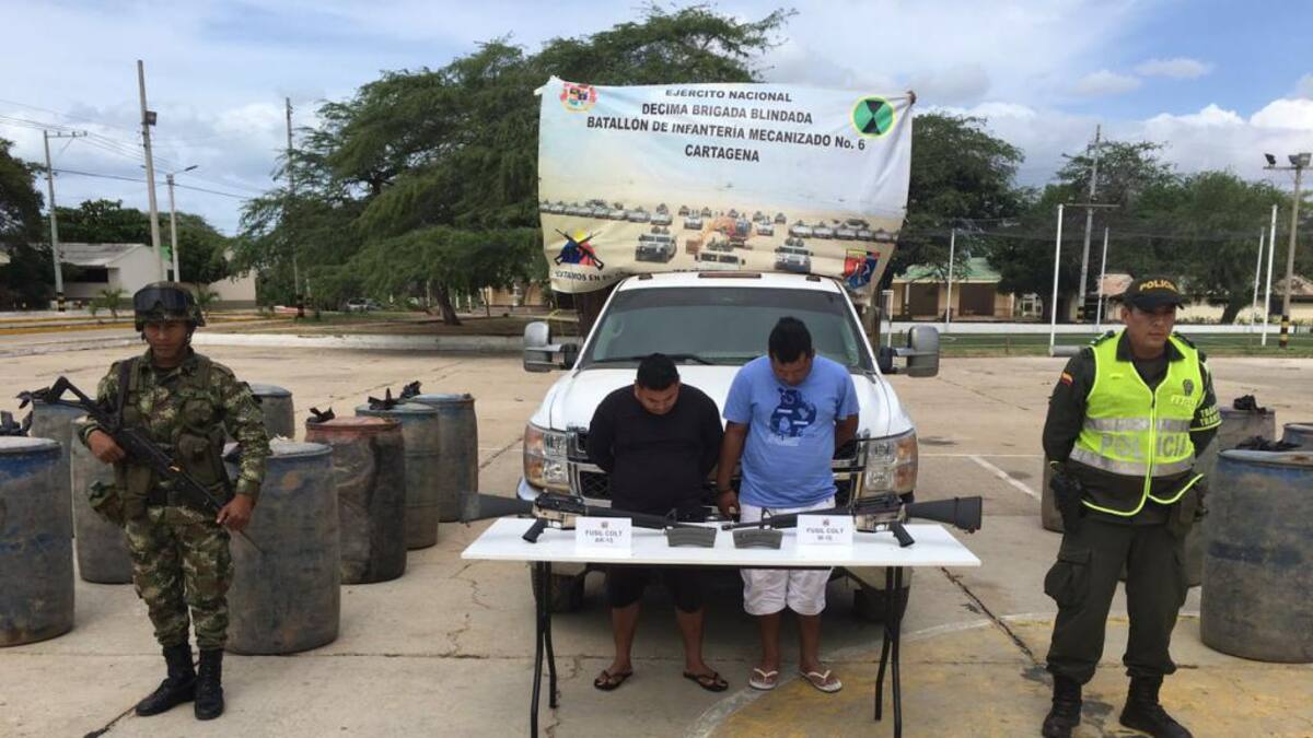 Tropas del Batallón de Infantería Mecanizada N°6 ‘Cartagena’, en labores conjuntas con la Policía de Tránsito y Transporte seccional Riohacha, dieron captura a dos sujetos que se movilizaban en un vehículo Venezolano con 1.300 galones de gasolina de contrabando y dos fusiles en el sector conocido como el Pájaro, municipio de Riohacha la Guajira.