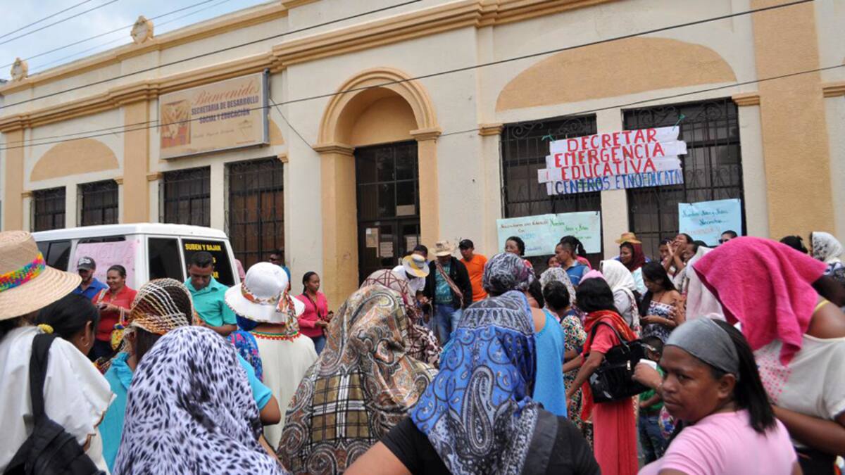 Indígenas wayuu protestan desde esta mañana en la secretaría de Educación de Riohacha para reclamar celeridad en la contratación a docentes de centros etnoeducativos, en el plan de alimentación y transporte escolar para 17 escuelas rurales ubicadas en la vía a Valledupar y Troncal del Caribe.