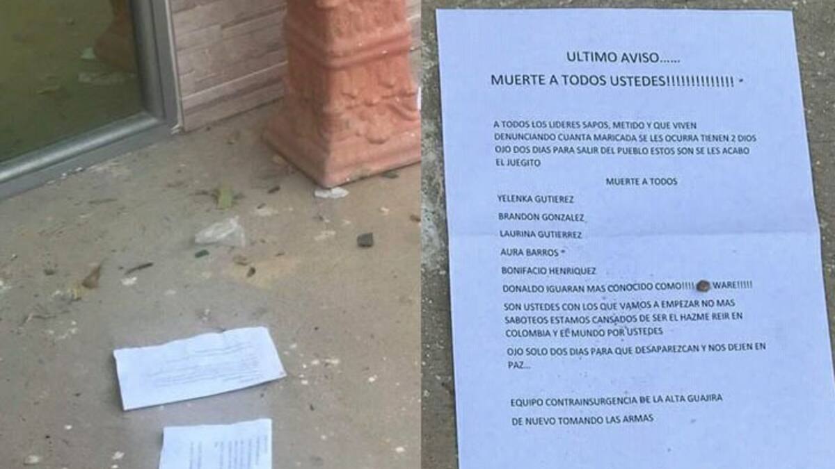 Según el panfleto supuestamente enviado por el Equipo Contrainsurgencia de la Alta Guajira, estos líderes se han encargado de hacer denuncias y por eso los tildan de 'sapos' y les dan dos días para que salgan del municipio.