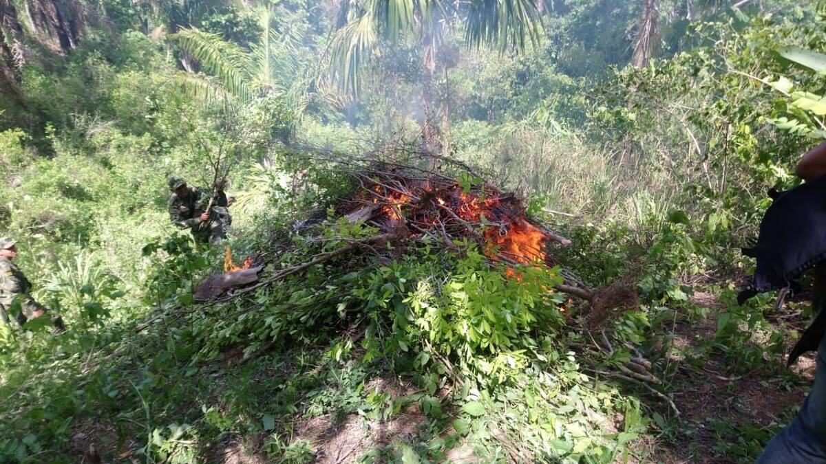 Al llegar al lugar encontraron un cultivo de plantas de coca en un área cultivada de dos hectáreas y medias, con un total de plantas cultivadas aproximadas de 2.400 matas. Allí se cultivaba, secaba y se empacaban las hojas de coca las que luego eran transportadas hasta otro lugar que es desconocido, para hacer el proceso de la sustancia prohibida.