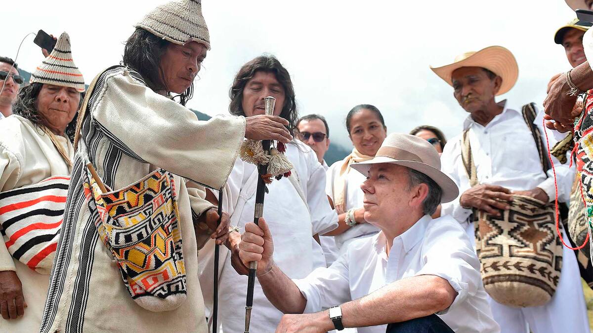 Juan Manuel Santos llegó la mañana de este viernes a San Miguel, Sierra Nevada de Santa Marta (jurisdicción de La Guajira), para devolverle a los mamos y jefes espirituales indígenas el bastón de mando que le prestaron hace ocho años como símbolo de aprobación a su exaltación como presidente del país.