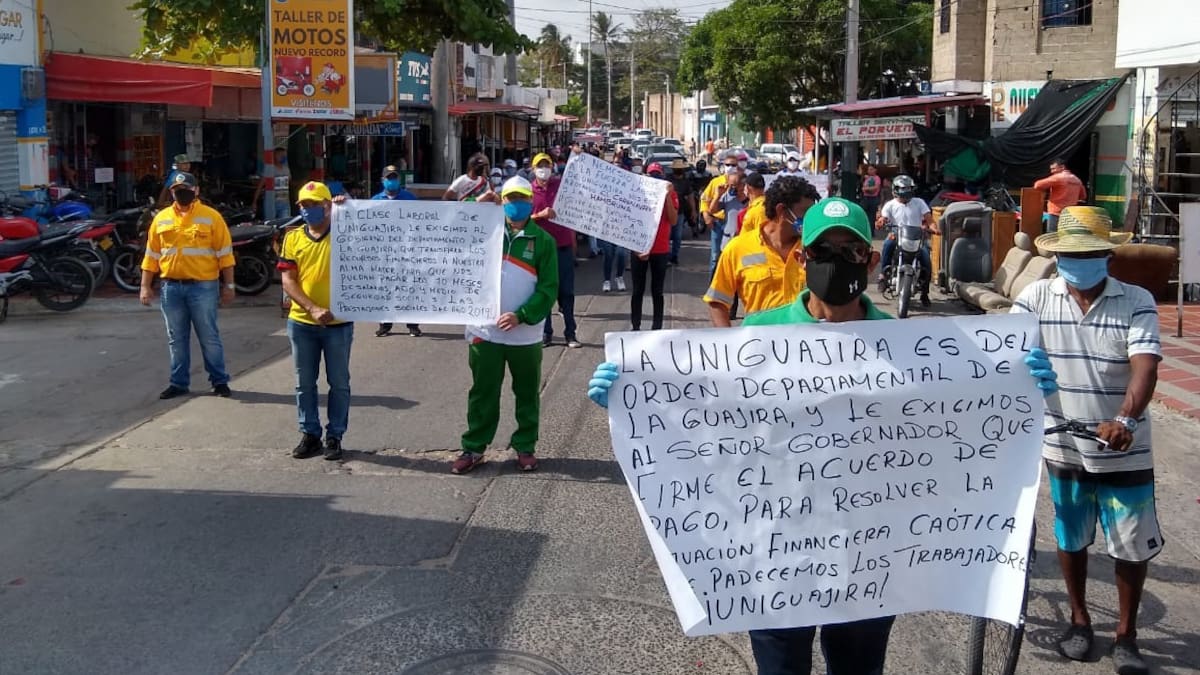 Cerca de 50 personas entre docentes, trabajadores y estudiantes de la Universidad de La Guajira, han iniciado una marcha por las principales calles de la ciudad de Riohacha como un mecanismo de presión al Gobierno del departamento para que este gire los aportes por Ley 30 y otras obligaciones que hoy los mantienen en graves problemas financieros.