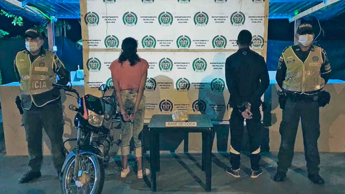 Un hombre y una mujer que a bordo de una motocicleta transportaban más de un kilogramo de base de clorhidrato de cocaína, fueron capturados por unidades de la Policía Nacional tras una requisa desarrollada en un puesto de control localizado en el kilómetro 53 entre Palomino y Riohacha.