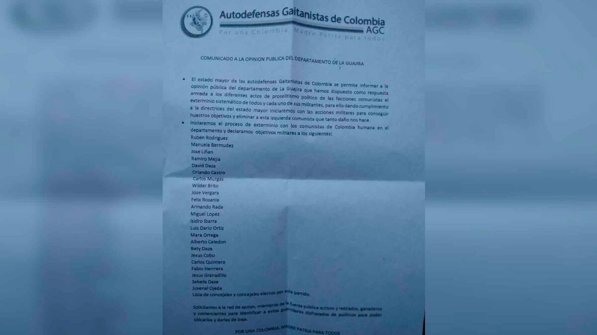 En la amenaza, que lleva el logo de las Autodefensas Gaitanistas de Colombia, señalan que es una 'respuesta armada a los diferentes actos proselitistas de las acciones comunistas, el exterminio sistemático de todos y cada uno de sus militantes; iniciaremos un proceso de exterminio con estos comunistas a quienes declaramos objetivo militar'.