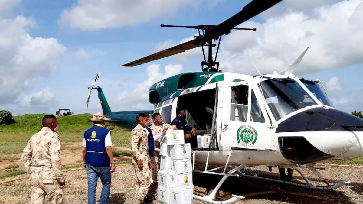 En dos helicópteros de la Policía nacional y con la ayuda de efectivos del Ejército se está trasladando la ayuda humanitaria que anunció el gobierno nacional hacia los corregimientos de la Alta Guajira.