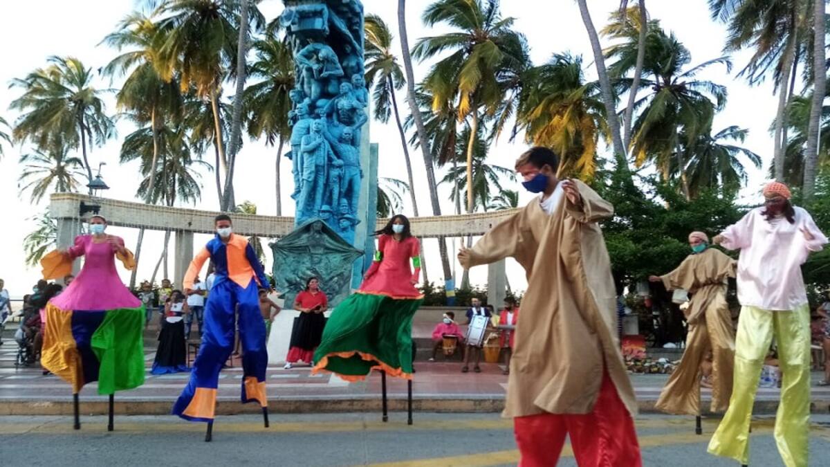 A cielo abierto, niños y jóvenes del barrio Villa Fátima de Riohacha, presentaron en la Avenida Primera el resultado del proceso de teatro en técnica de zancos que se llevó a cabo en el marco del Programa de Unidades Locales de Cultura de la Dirección Distrital de Cultura.