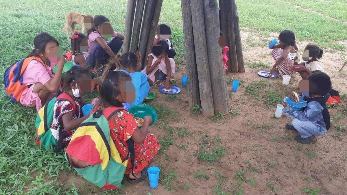 En las imágenes se puede apreciar que las clases son bajo una enramada que los protege del sol, sentados en el suelo sobre la arena, y con un improvisado tablero sostenido por dos troncos de los árboles. Los menores reciben una ración alimentaria en horas de la mañana al iniciar la jornada escolar, en platos que ellos mismos deben llevar desde sus viviendas, allí les sirven una arepa con un vaso de chicha.