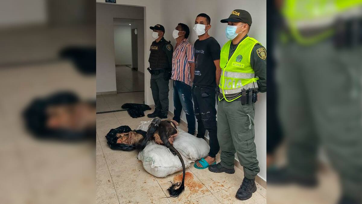 Cuando los policías llegan a la propiedad inician la revisión encontrando en los límites de la finca a dos hombres que fueron identificadas como William Enrique Pimienta Ramos, de 56 años de edad, natural de Pedraza Magdalena, y Jeremías de Jesús Sepúlveda Támara, de 35 años de edad, natural de Santa Marta, quienes además conservaban en su poder las sogas y los cuchillos con los que seguramente inmovilizan y sacrifican a los animales, ya habían llenado cuatro bultos de carne de res.