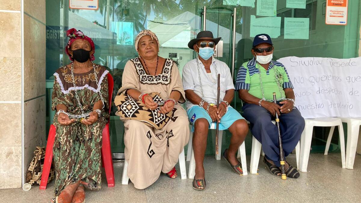 Durante la noche del lunes las 30 familias, en las que hay niños, jóvenes y ancianos, durmieron a la intemperie en el parque Almirante Padilla de Riohacha y la mañana de este martes se encadenaron frente a las instalaciones de la Gobernación de La Guajira para pedir las garantías necesarias que permitan el retorno a su territorio.