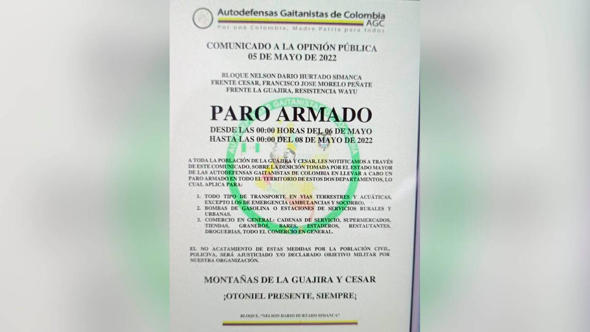 En tensión se encuentra La Guajira por el panfleto que circula a través de redes sociales, en las que las denominadas Autodefensas Gaitanistas de Colombia, frente Resistencia Wayuu, anuncian un paro armado en este departamento desde este viernes seis hasta el domingo ocho de mayo.