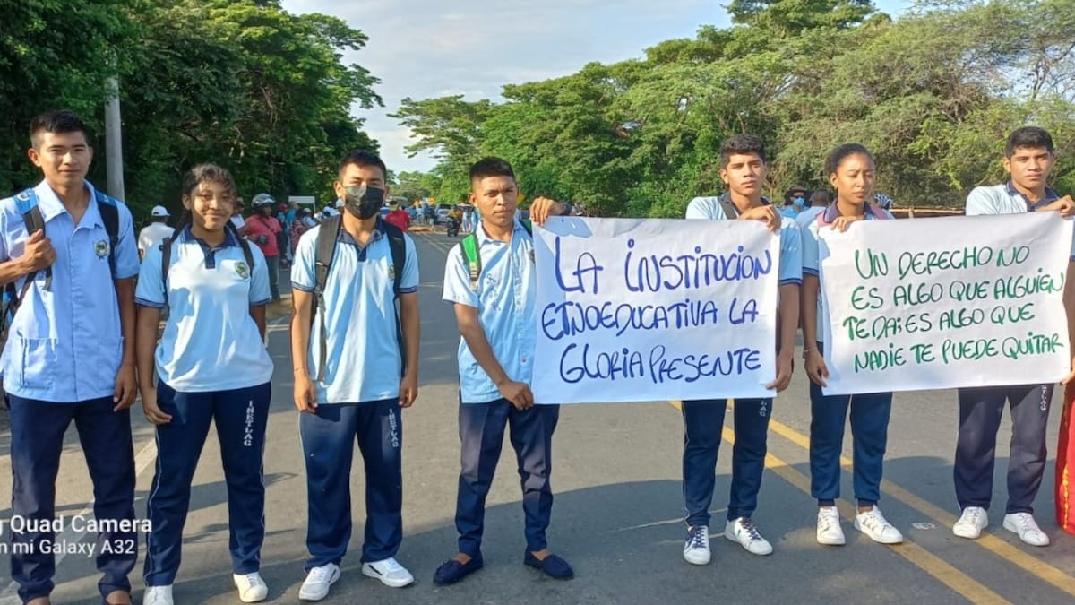 En una de las carteleras se logra leer que 'por el derecho a la educación, exigimos el transporte escolar y exigimos nombramiento de docentes para nuestra Institución Laachon Mayapo'.