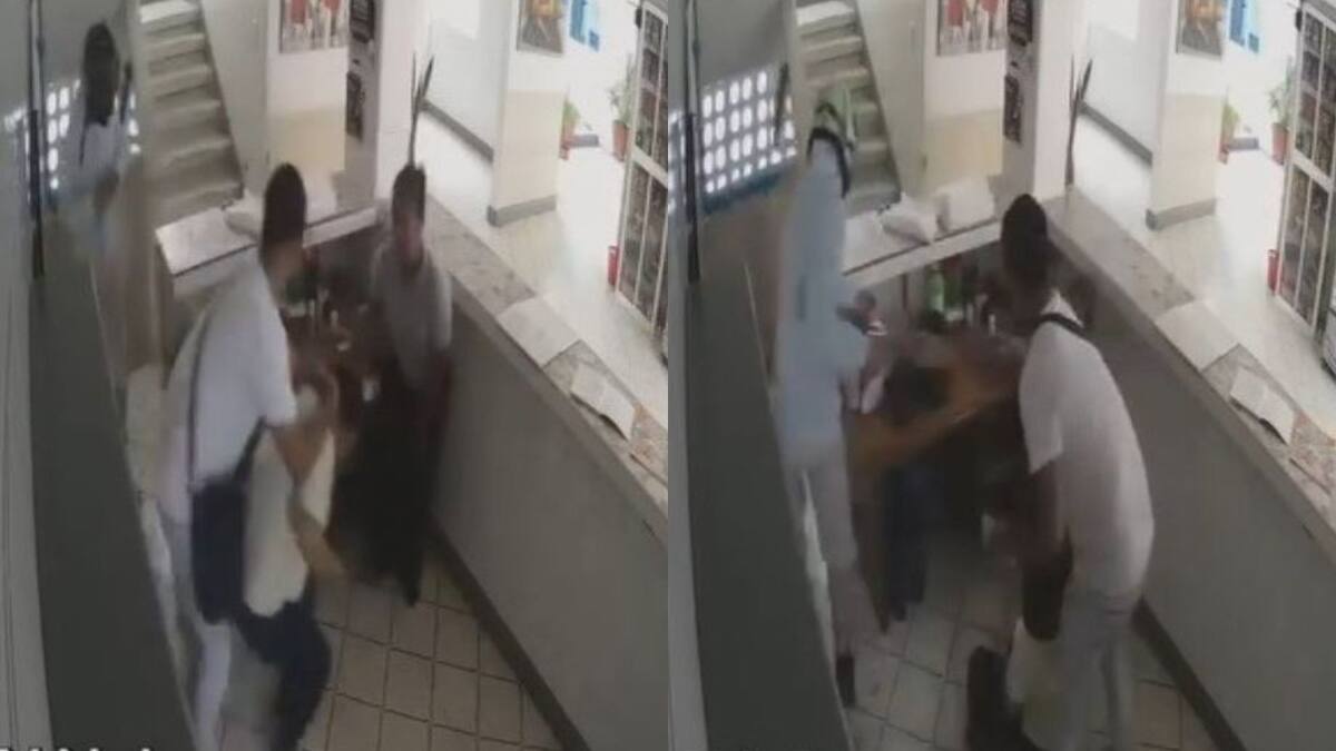 En las imágenes, uno de los asaltantes, vestido con ropa blanca, casco, y tenis, vigila la entrada, fingiendo una llamada telefónica para evitar levantar sospechas. Su cómplice, que portaba un suéter blanco, una mochila cruzada en el pecho y una gorra, se acercó para iniciar el ataque.