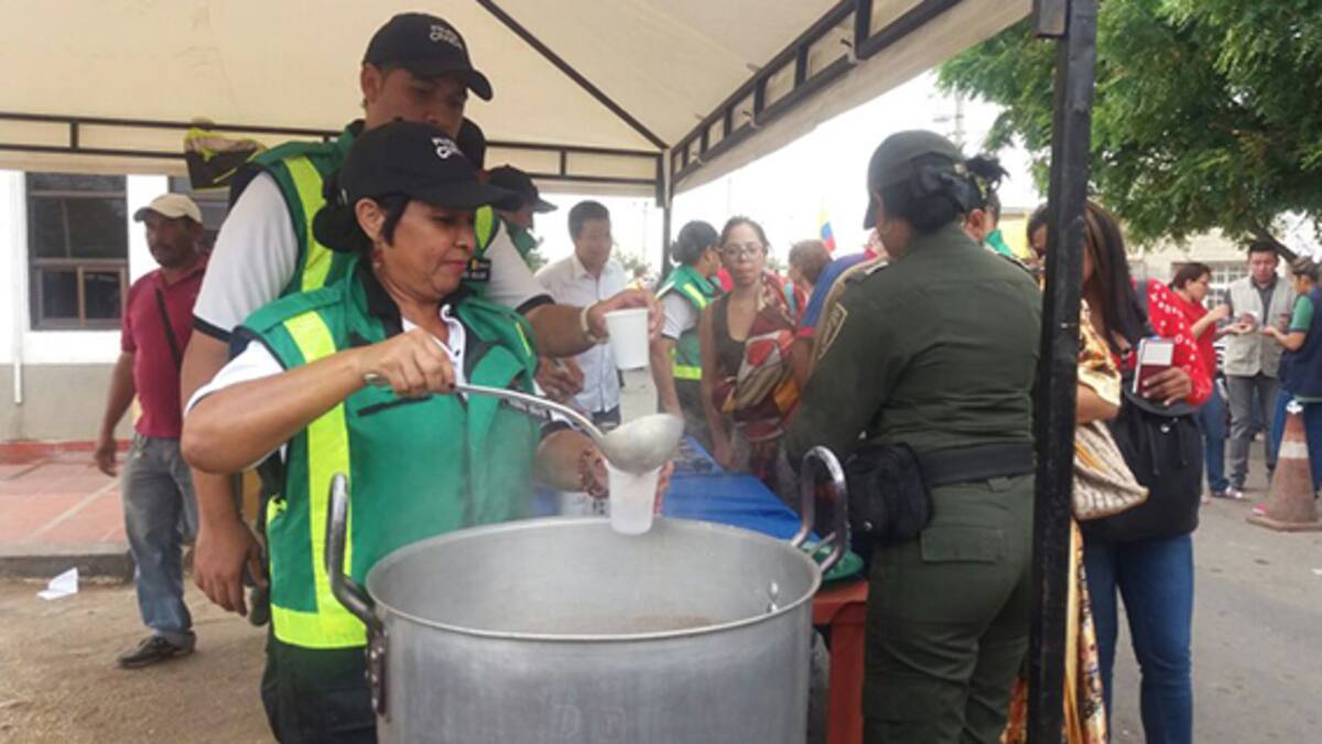 Las fronteras entre Colombia y Venezuela, que permanecían cerradas desde hace casi un año, fueron reabiertas este sábado al paso peatonal. Con pan y chocolate, Policías colombianos reciben a las personas que entran al país por la frontera de Paraguachón.