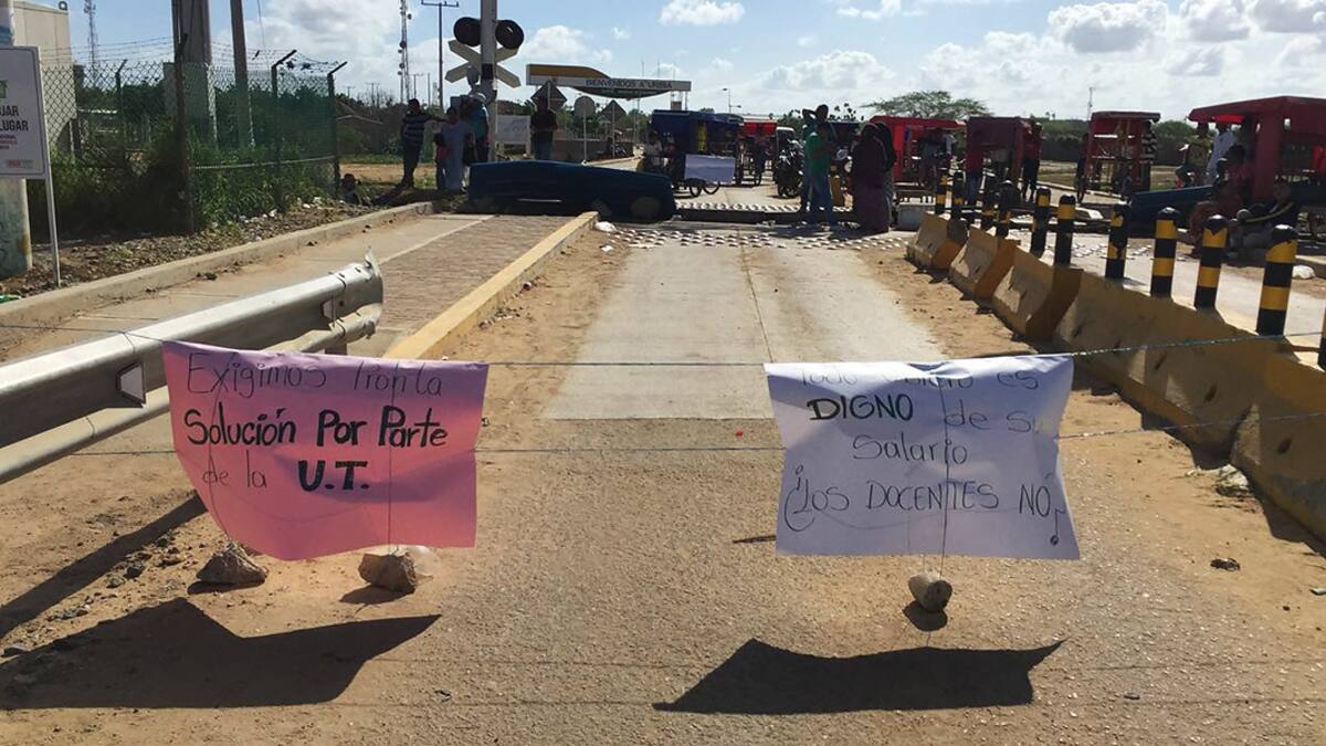 Estos son profesores que están contratados en Uribia por la Unión Temporal Akirajiapulee Akuipa Wayuu, con cuyos representantes estuvieron dialogando, pero no llegaron a ningún acuerdo por lo que dicen que se mantendrán en la vía hasta que les den solución al problema.