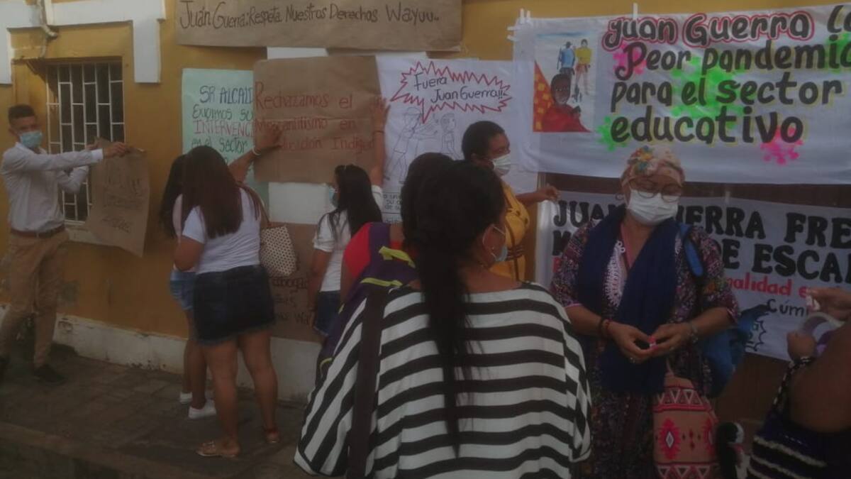 Fueron cerca de setenta autoridades tradicionales de diferentes rancherías de Uribia que se hicieron acompañar por docentes, los que están haciendo el reclamo ante las autoridades municipales y ante el administrador educativo de Uribia Juan Guerra, a quien le piden en algunos de los carteles que renuncie al cargo, al considerar que no viene cumpliendo con los postulados del cargo y no satisface las expectativas que ellos tienen.
