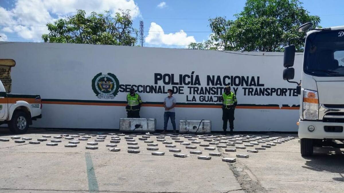 Así fue como encontraron el doble fondo donde estaban escondidos 128 paquetes o ‘panelas’. La droga también se había mimetizado en dos tanques usados para el almacenamiento del combustible del camión marca JAC, color blanco y placa JKU 36D que además tiene en su vidrio delantero la leyenda 'Dios es mi Guía.'