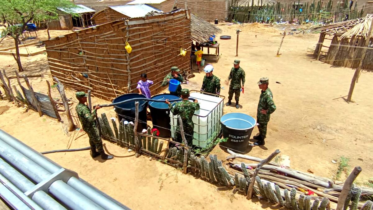 El Ejército Nacional a través de los Batallones de Ingeniero N° 1 y 18, en conjunto con la Junta de Acción Comunal del barrio Etnia Wayuu de Uribia, La Guajira, lograron la distribución de 10.000 litros de agua potable, abordando así una necesidad vital de la comunidad local.