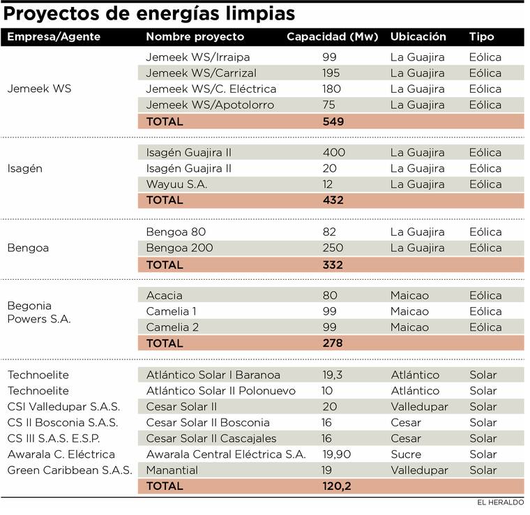 EL HERALDO conoció que la mayoría de estas iniciativas, que reposan en una especie de banco de proyectos de la Unidad de Planeación Minero Energética, UPME, tienen a la Región Caribe como epicentro de generación: están formulados 12 proyectos eólicos –aprovechamiento del viento– para La Guajira, con una producción de 1.591 megavatios (MW), y hay otros 7 solares, de los cuales 4 están propuestos en el Cesar, 2 en Atlántico y 1 en Sucre, con capacidad para 120,2 megavatios. (Ver tabla: Los proyectos propuestos)