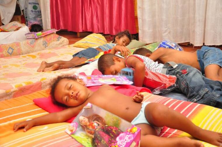 En un cambuche que se recorre completamente al dar 20 pasos, la familia Ávila Cabrera, conformada por 18 niños y 6 adultos, se aprestan a descansar, Jean, de 10 años, toma en sus brazos uno de los carritos que le regalaron y sueña con hacer competencias con su vecino Carlos, pero sabe que por ahora, los piques tendrán que esperar, ya que su ‘llave’ está viviendo donde un familiar en Barranquilla. Sería chévere poder mostrarle los regalitos a mis amigos, pero como la casa está ‘ahogada’ no se puede. Ojalá se seque pronto y podamos volver, dormir en una colchoneta sobre el piso lo deja a uno con la espalda adolorida.