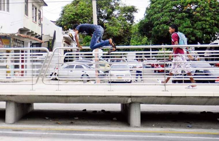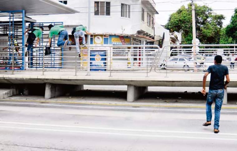 La maniobra para hacerle ‘conejo’ al pago del tiquete de transporte es muy simple: cruzar la calle vacía o sortear el tráfico de vehículos, verificar que no haya ningún funcionario de Transmetro o algún policía y por último volarse la baranda metálica.