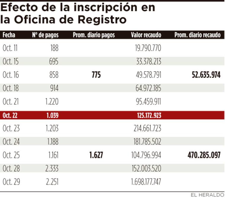 Así lo reportó ayer el gerente de la Oficina de Gestión de Ingreso del Distrito, Fidel Castaño, que indicó que de un promedio de $52 millones diarios que se recaudaban una semana antes del reporte a Instrumentos Públicos, se pasó a $470 millones diarios en la última semana.