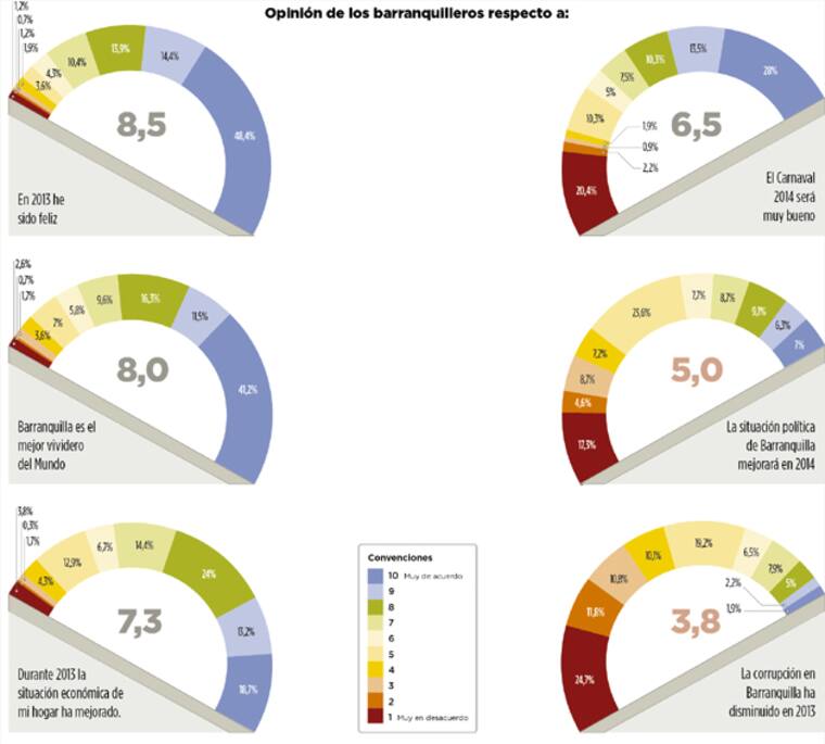 Pero no todo es felicidad. Y ahí surge la ambivalencia de la ciudad. Porque apenas 5 de cada 10 personas cree que en 2014 mejorará la situación política y tan solo 3,8 de cada 10 cree que la corrupción haya disminuido este año. Los que más piensan que todo mejorará son los empleados. Los pensionados son los más pesimistas frente a la mejora política.
