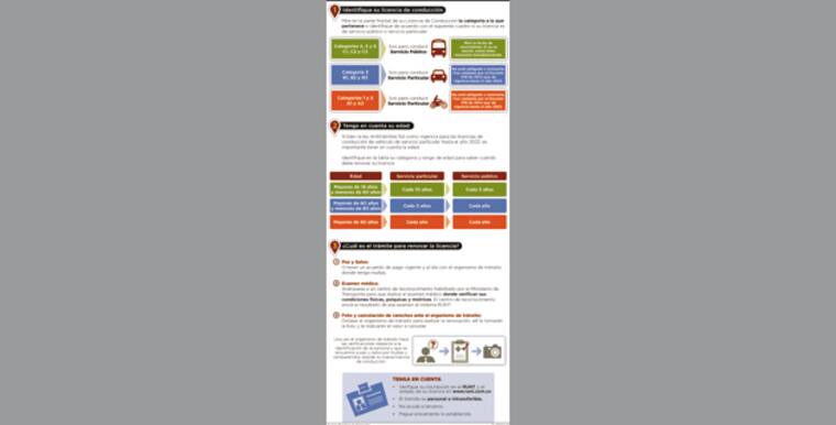 La licencia para conducir vehículo de servicio público debe renovarse cada tres años y la licencia para conducir vehículo particular debe renovarse cada diez, salvo los conductores que estén en el rango de edad, entre sesenta y ochenta años, quienes deberán renovarla cada cinco, y los conductores mayores de ochenta 80 años, que deberán renovarla cada año.