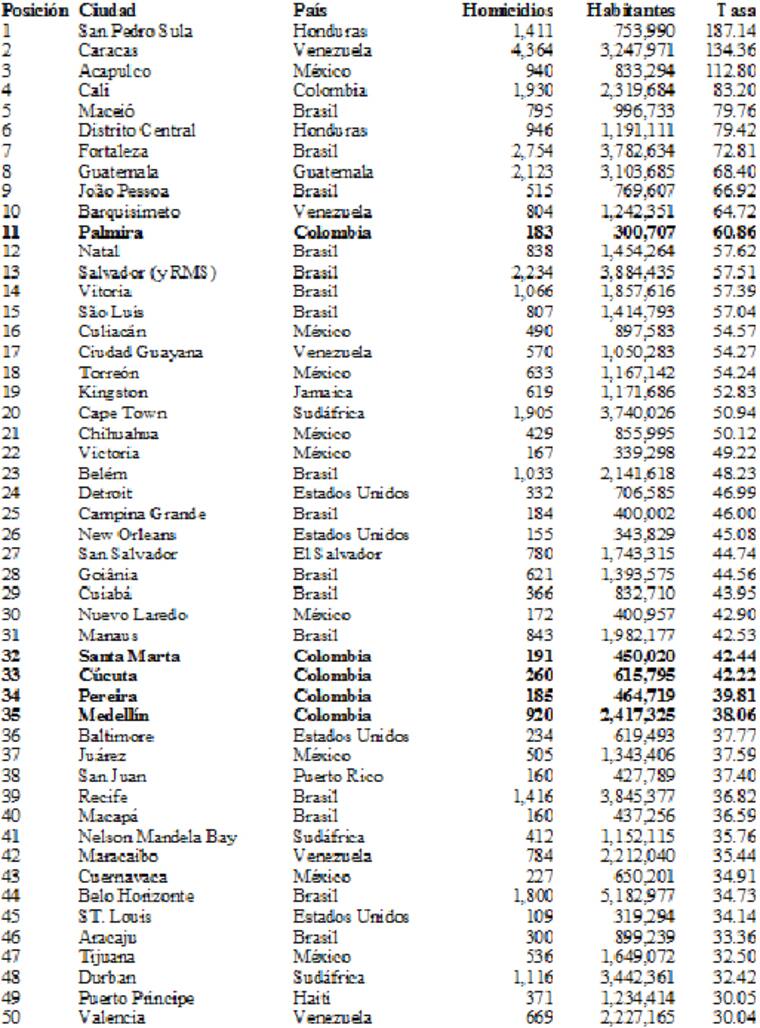 'Con una tasa de 187 homicidios por cada 100 mil habitantes, la urbe hondureña de San Pedro Sula ocupó por tercer año consecutivo el liderato del ránking de las 50 ciudades más violentas del mundo', señala el informe de la ONG.