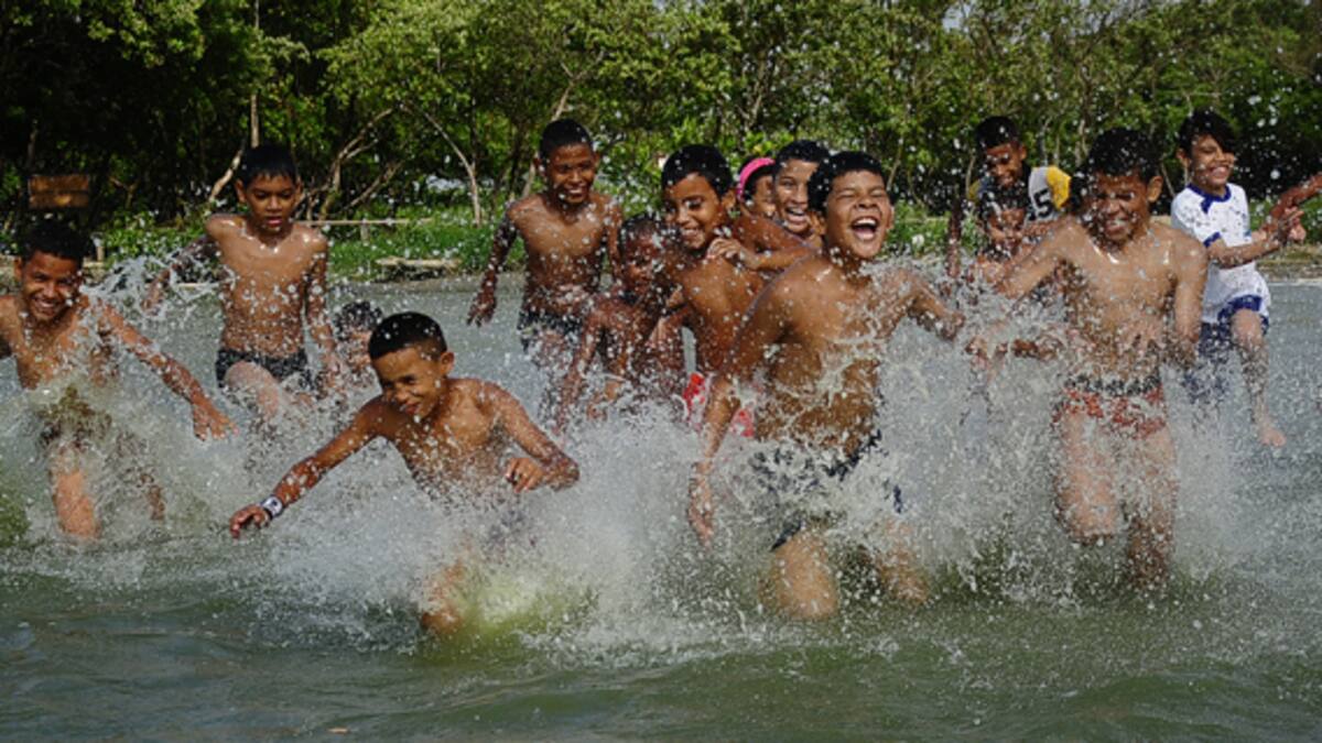 Un numeroso grupo de infantes que con sus piernas surcan contra la corriente, sin saberlo, estaban en fricción con un líquido que posee altas dosis de concentración fecal.