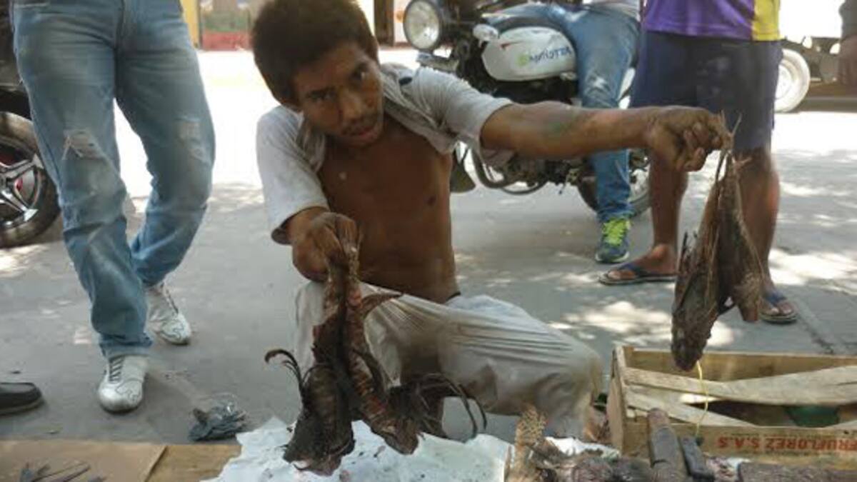 Julio Vizcaíno, uno de los comerciantes, indicó que la alternativa de venta de esta especie es por 'rebusque, porque la situación está dura, las lanchas salen y traen poco, lo que más abunda es el pez león y el sable'.