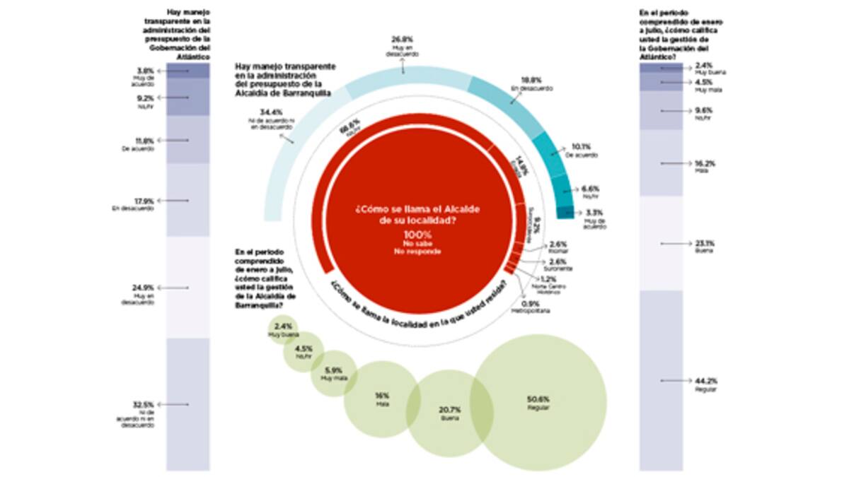 Otro de los temas revisados fue la efectividad de la gestión de las cinco entidades públicas más importantes del departamento, en las que todas fueron calificadas como regulares. La puntuación más alta para el calificativo señalado lo tuvo la Alcaldía distrital con un 50,6% y el menor fue para la Gobernación con un 35,4%. También hubo cuestionamientos sobre el manejo con transparencia del presupuesto distrital, en el que un 26,8% dijo estar 'muy en desacuerdo', con que estén siendo bien manejados los recursos.