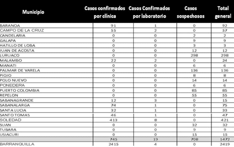 De los municipios del Atlántico, Barranquilla tiene la más alta concentración de casos de Chikunguña, con 2.419, seguido de Soledad con 421; Luruaco, 298; Palmar de Varela, con 136; Baranoa con 92 casos, Puerto Colombia con 85 reportes, Sabanalarga, 75 casos, Campo de la Cruz, 57, y Santo Tomás, 47 reportes. Minsalud, en el informe presentado este lunes, tiene especial vigilancia en el municipio de Campo de la Cruz.