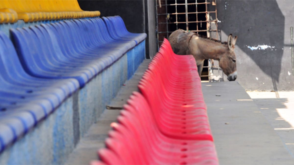 'Esto no es un campo de béisbol, parece más un potrero', afirma el 'Docty' con cara de indignación mientras el burro se pasea por la zona de graderías.