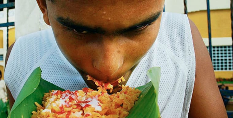 Algunos prefieren comer el arroz directamente del plato o la hoja de bijao, por lo que la marca en su boca es mayor.