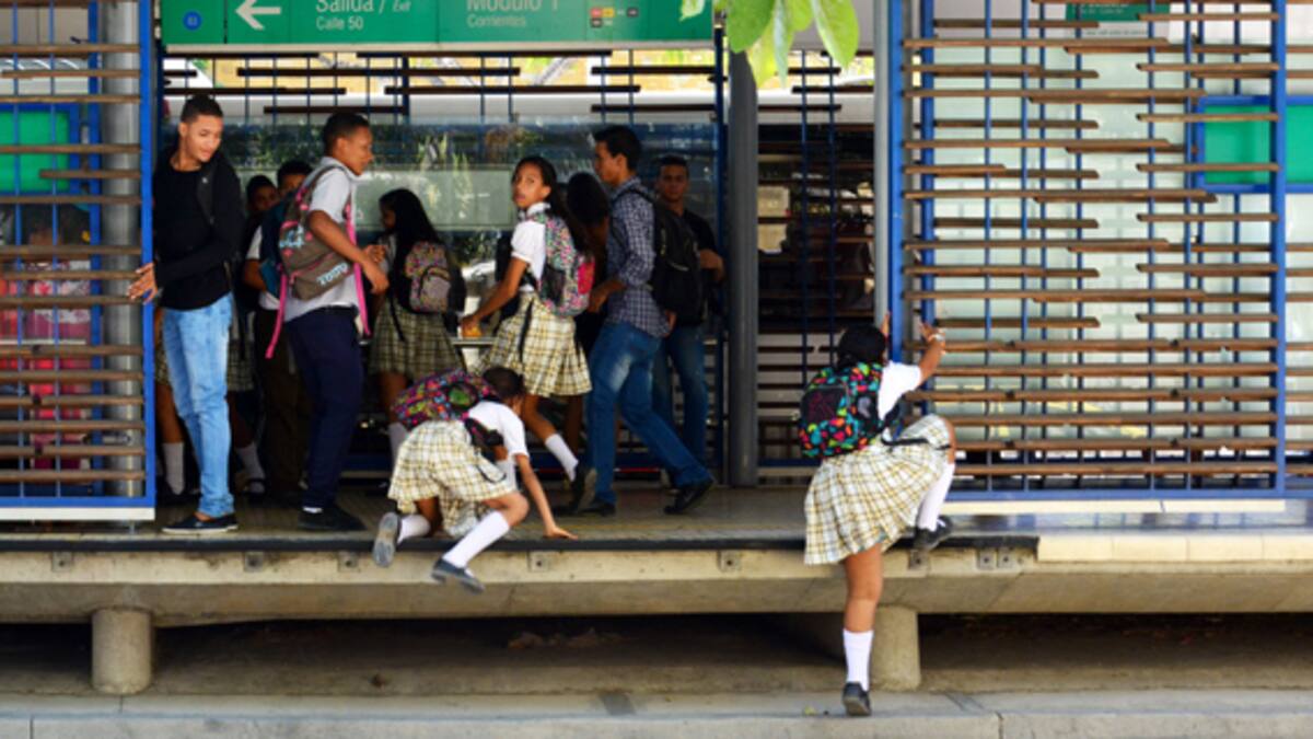 Las burlas de un grupo de jóvenes estudiantes que ingresaron sin pagar sus pasajes a la estación La Catedral del Sistema de Transporte Masivo Transmetro, contrasta con el peligro que implica la maniobra que realizaron.